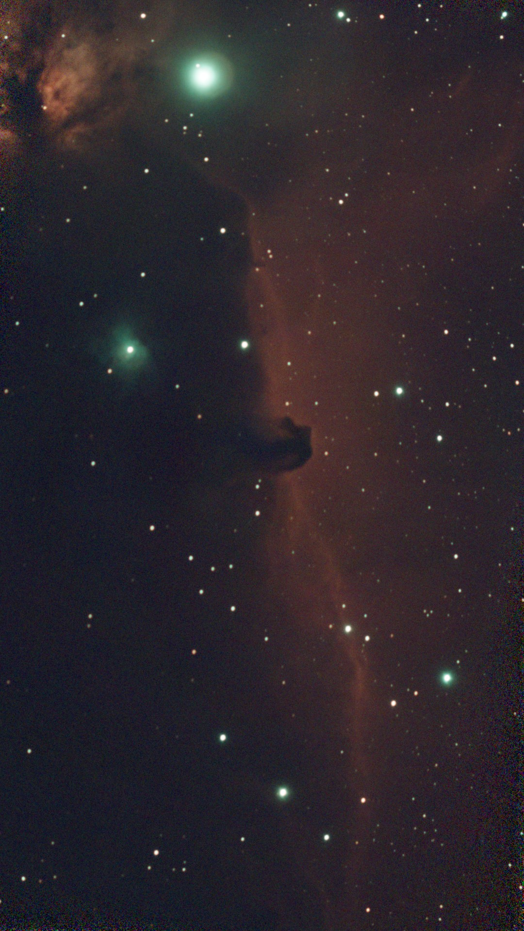 Dark nebula silhouetted against bright emission nebula. Shows dust absorption, stellar formation regions, and nebular physics.