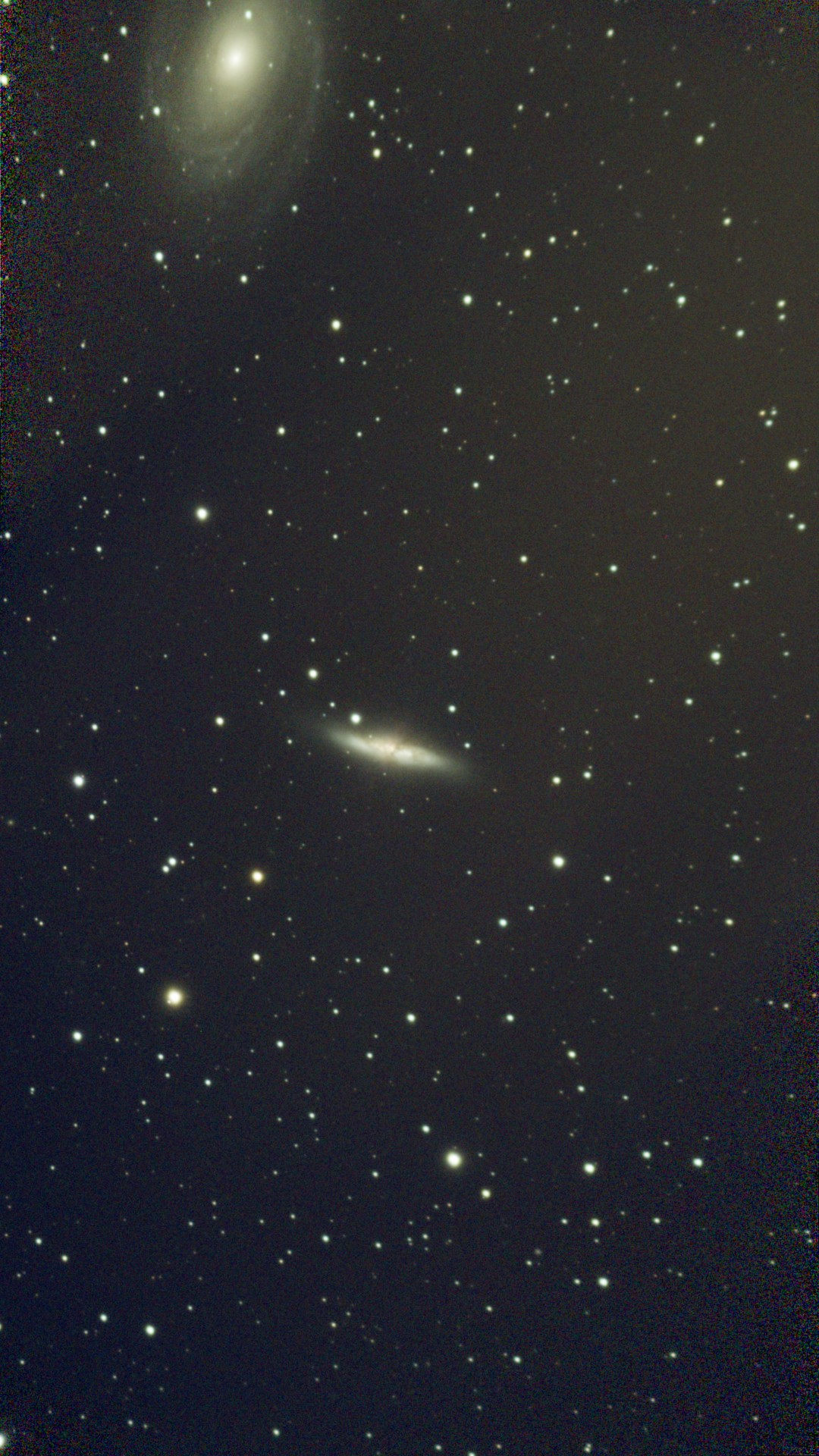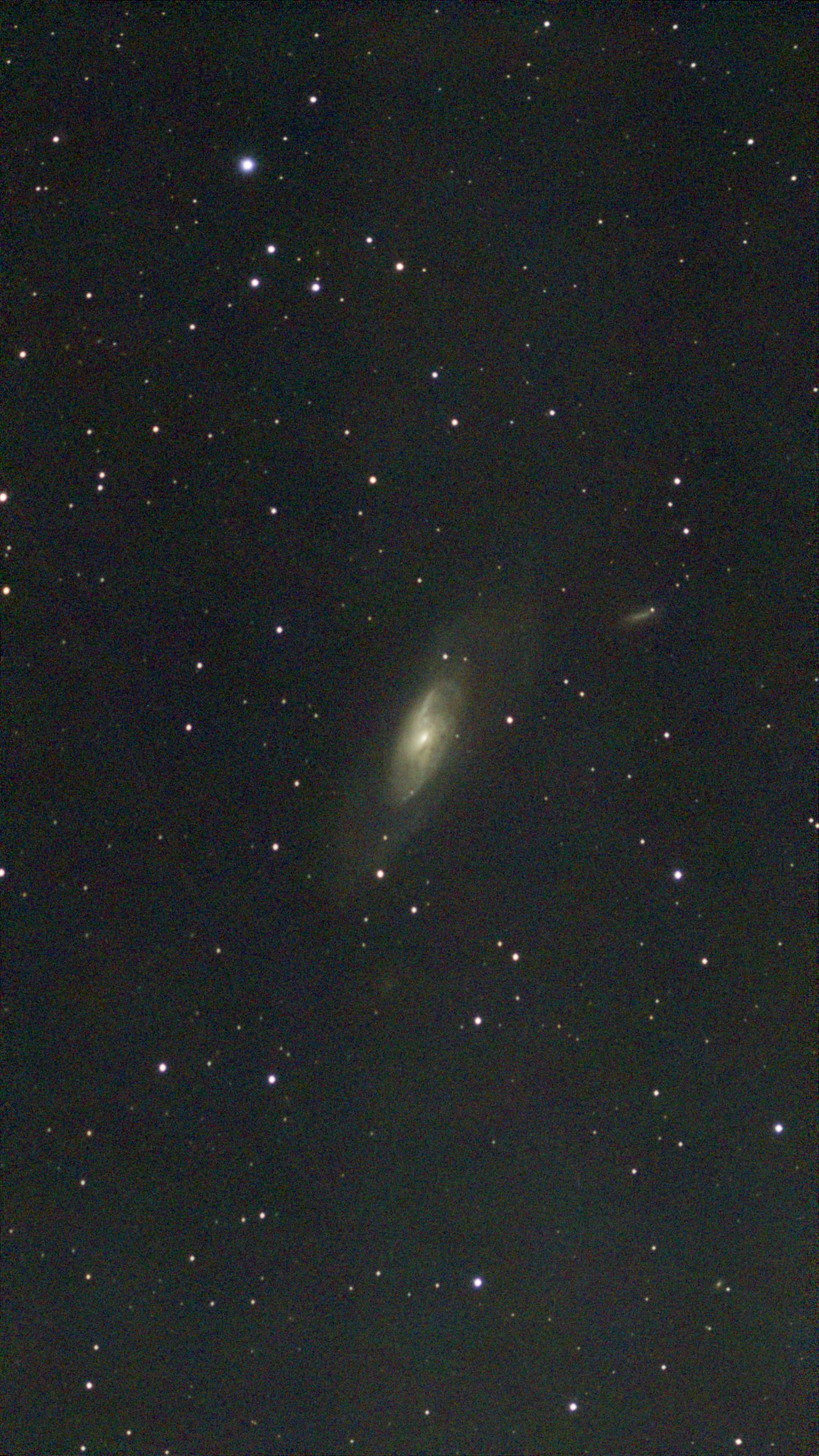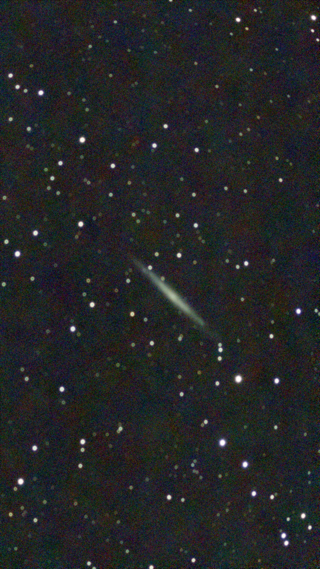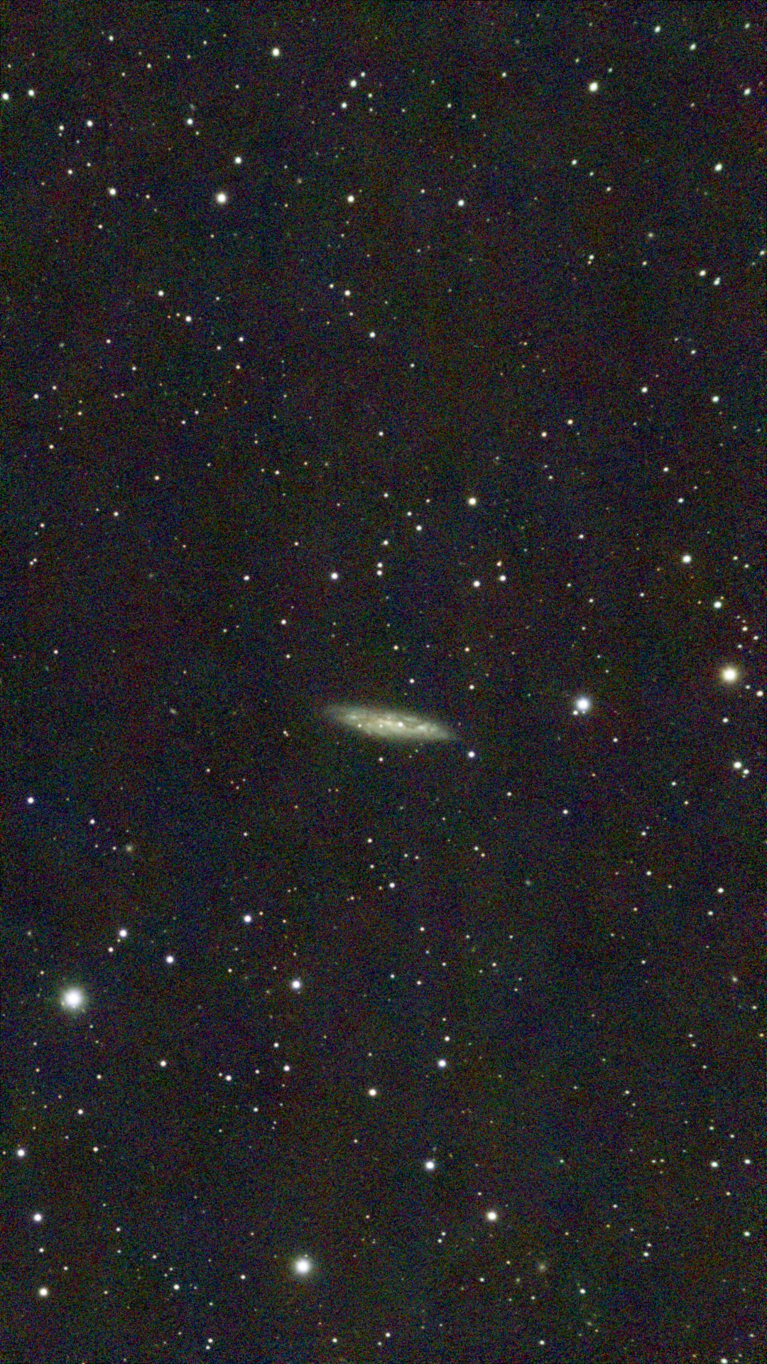 A beautiful edge-on spiral galaxy in Canes Venatici. Shows the thin disk structure of spiral galaxies and prominent dust lane absorption.